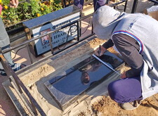 Когда памятник был изготовлен, идём на место захоронения. На данный момент на могиле находится лишь холмик, на котором растут цветы.